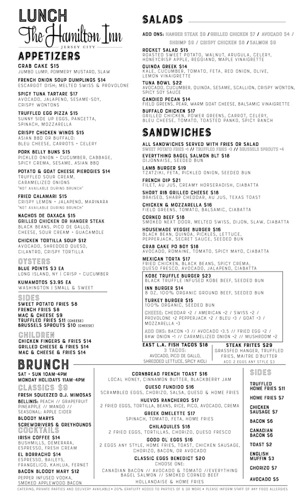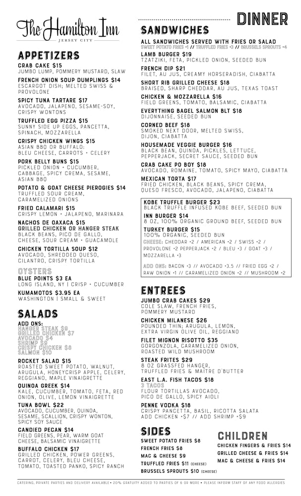 Get Fast Delivery at the Best Price. Check out the menu for The Hamilton InnThe menu includes beverage menu dinner menu weekly specials menu lunch brunch menu late night menu and dessert menu. Online menus items descriptions and prices for The Hamilton Inn - Restaurant - Jersey City NJ 07030.